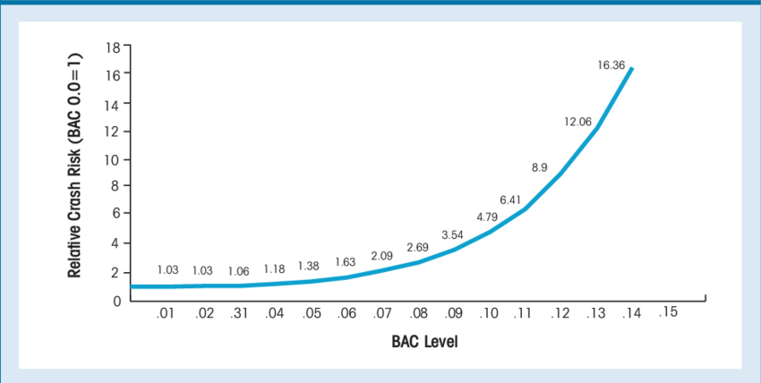 The following chart shows the composite relative crash risk as a function of BAC level. We can see that even at very low BAC levels, relative risk will rise.