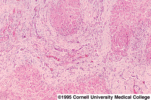 First, a healthy liver. Notice the clearly defined blocks of tissue with blood vessels permeating throughout. This picture reminds me of an aerial view of a pleasant residential neighborhood: