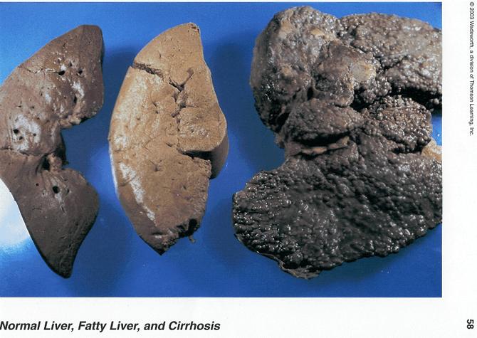 The gross anatomy is just as grim. To my knowledge, the normal and fatty livers were collected individuals who died of causes other than excess drinking. The liver to the right, showing cirrhosis, is blackened, and it is hard as a brick: