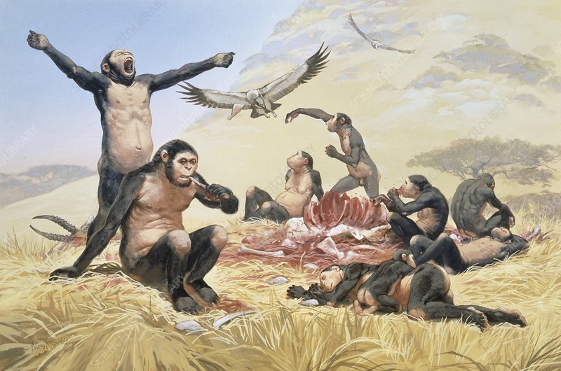 L-R. 1) Homo habilis family troop migrating across savannah; 2) Relatively equal size of females and males suggests that Homo habilis was the first to engage in monogamy; 3) Family troop sharing a kill.