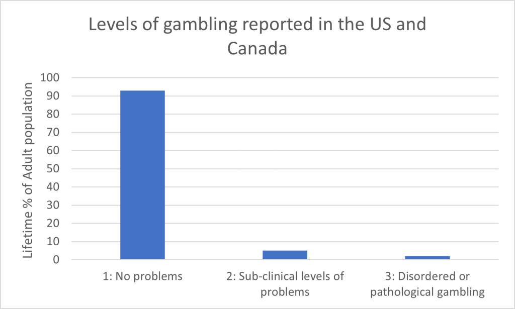 How prevalent is the problem of pathological gambling? Less than 10% of the adult population in the United States and Canada demonstrate behaviors characteristic of Level 2 (Sub-clinical levels of problems) or Level 3 (Disordered or pathological) gambling. (See figure below.)