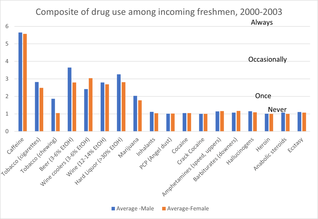 Between 2000 and 2003, I arranged with the Counseling Department at Christian Brothers University (Memphis, TN), where I taught biology, to distribute a questionnaire to incoming students enrolled in Orientation 100, a half-semester course for incoming freshmen to “learn the ropes” of becoming a college student. With this questionnaire, I was able to take a snapshot of alcohol and drug use among these students who had just graduated from high school. Here are the results, adapted from Table 5 of Mostert and Eisen (2008).
