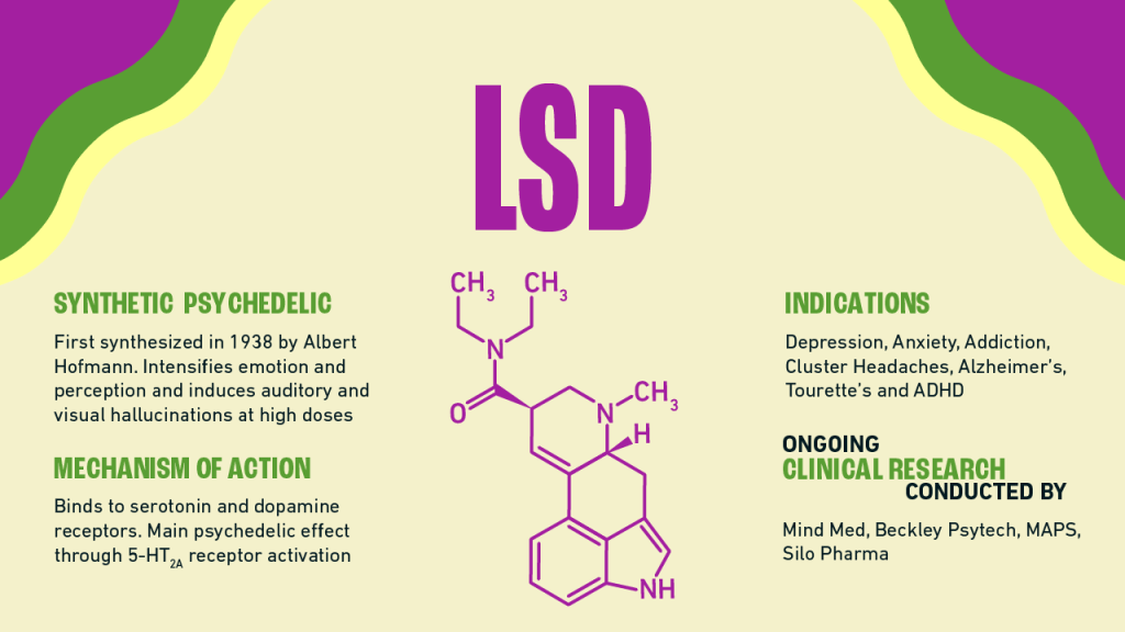 An entirely synthetic psychedelic, LSD was first produced in 1938 by Swiss chemist Albert Hofmann. The compound enhances emotion and perception and, at higher doses, induces auditory and visual hallucinations. It was heavily studied in the 1950s and 1960s, but was, like other psychedelics, banned in the late 1960s in the US, greatly compromising research efforts into the compounds.