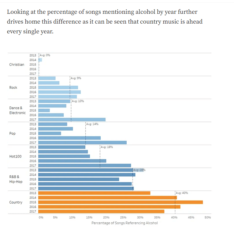 Inspecting the lists showed a startling number of songs were in the country genre, and as it turns out, there are numerous songs in the country genre that deal with alcohol. In fact, Mark MacArdle wrote an article, Does Country Music Drink More Than Other Genres? Investigating 5 years of lyrics to find out ( https://towardsdatascience.com/does-country-music-drink-more-than-other-genres-a21db901940b), in which he compared the content of various genres and found the following: