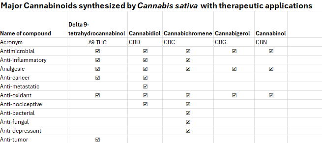 In a previous blog, , we looked at the therapeutic properties of cannabinoids, and the relevant table from that blog is shown below.